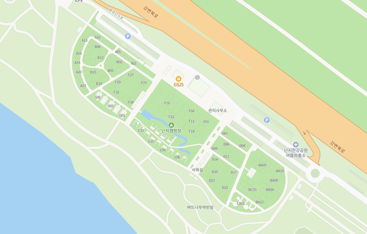 | 편의시설 | 화장실, 샤워실, 세척장, 매점, 바베큐존, 캠프파이어존 |