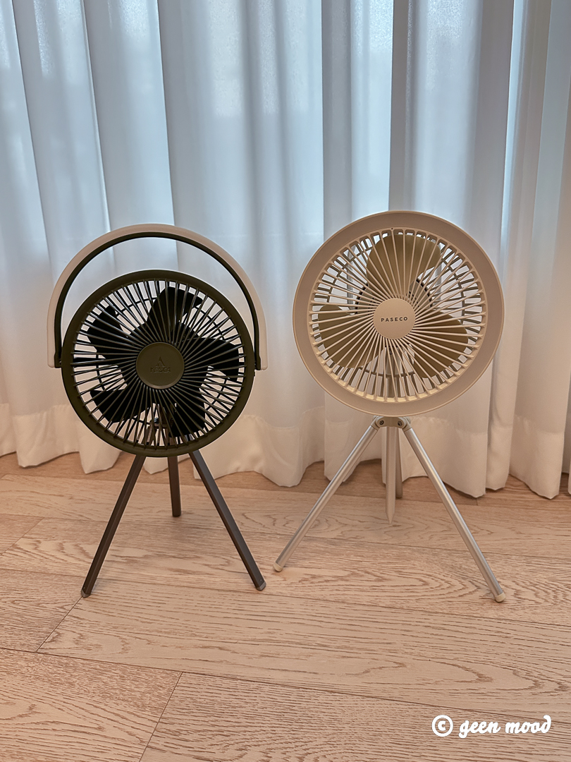 캠핑할 때 사용하는 두 가지 선풍기이다.