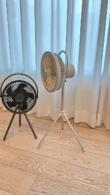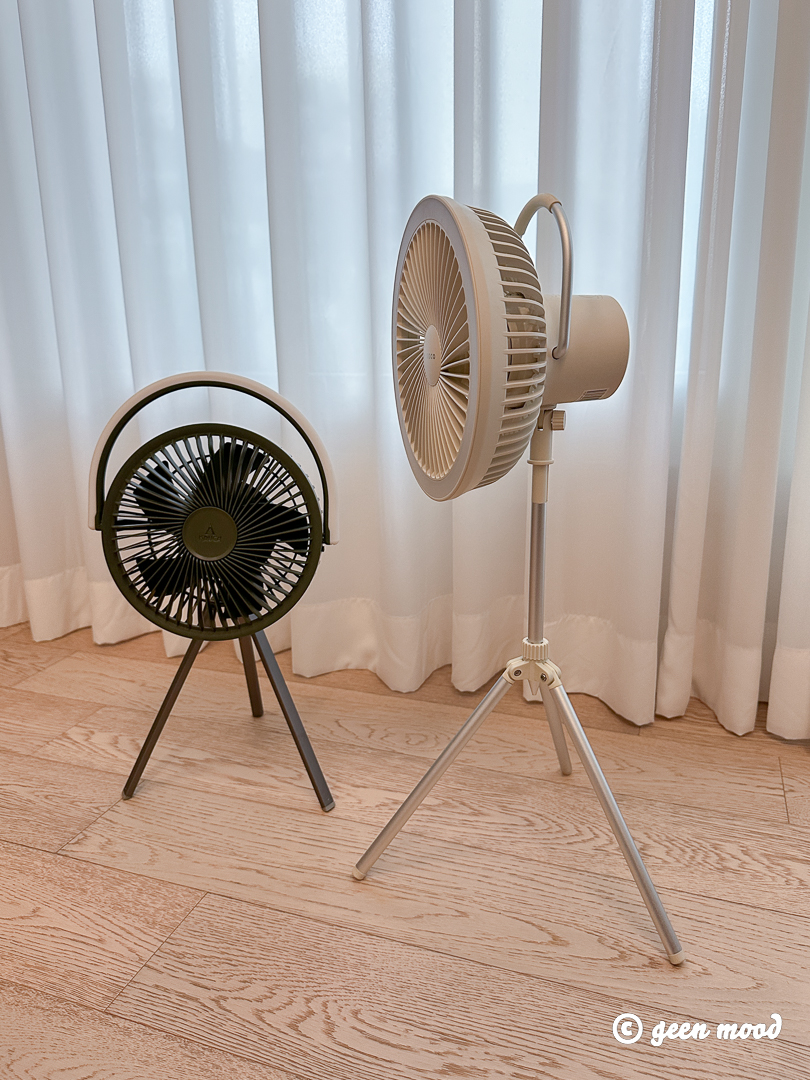 캠핑할 때 사용하는 두 가지 선풍기이다.