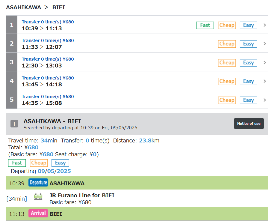 비에이역에서 아사히카와로 가는
